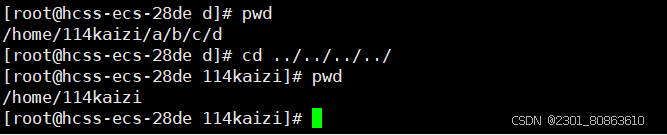 [root@hcss-ecs-28de 114kaizi]# 我们最后的时候是在d这个目录里面,然后我们怎么回去呢