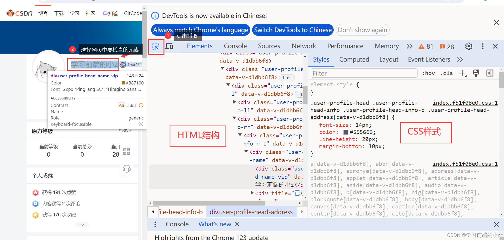 我们可以使用开发者工具的 “元素选择器” 功能快速定位页面中的某个元素。点击左上角的选择工具图标,然后在页面中点击某个元素,开发者工具会自动定位到对应的 HTML 代码,方便我们查看和调试。