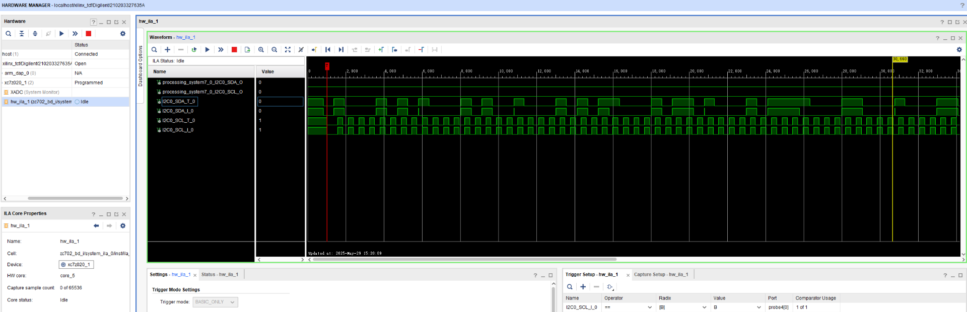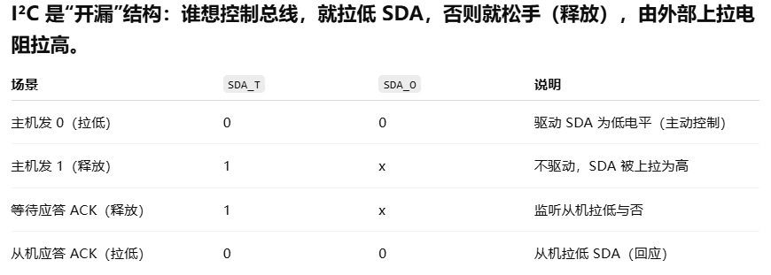 Master Send: 0x13, 0x14, 0x15, 0x16, 0x17, 0x18, 0x19, 0x1A, 0x1B, 0x1C, 0x1D, 0x1E, 0x1F, 0x20, 0x21, 0x22,I2C 控制器比较特殊,与SPI控制器不同, SDA_O 或者SCL_O是没有高电平输出的,在I2C里,SDA和SCL必须作为三态来使用,不能把SCL_O直接拉出来使用。