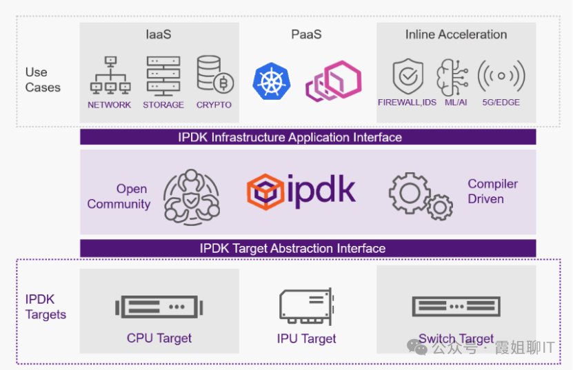 IPDK 在 Linux 中运行,并使用一组成熟的工具(如 SPDK、DPDK 和 P4)来实现平台中的网络虚拟化、存储虚拟化、工作负载配置、信任根和卸载功能。
