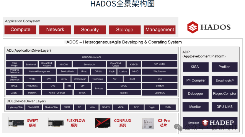 HADOS整合DPU相关的软件能力,通过灵活高效的编程接口,将DPU的异构计算能力完全开放,能够帮助开发者快速构建DPU应用和服务。HADOS支持网络虚拟化和硬件卸载,P4可编程网络转发引擎、多元化的存储设备和存储网络,灵活可靠的安全解决方案。
