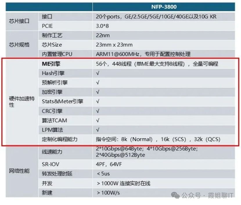 我们来看一个具体的芯片:NFP3800的性能吧。如下表所示,它有56个ME,供448个线程,还集成了各种硬件加速引擎: