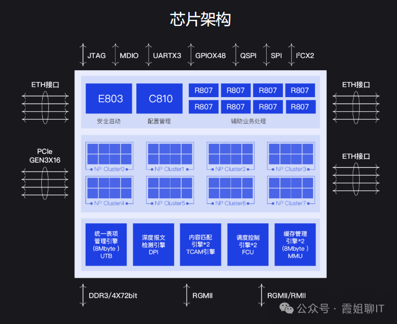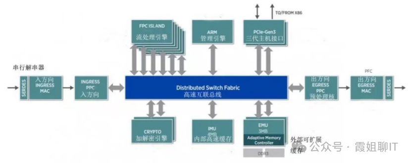 它家的核心DPU芯片--NFP网络处理器芯片内部结构如图1所示。