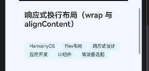 Text("响应式换行布局(wrap 与 alignContent) ").fontSize(20).fontWeight(600).foregroundColor('#262626').width('90%')