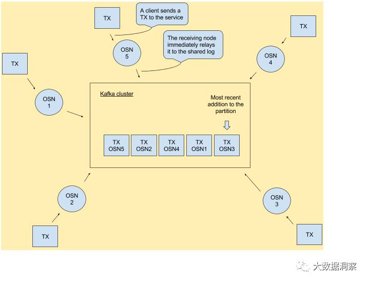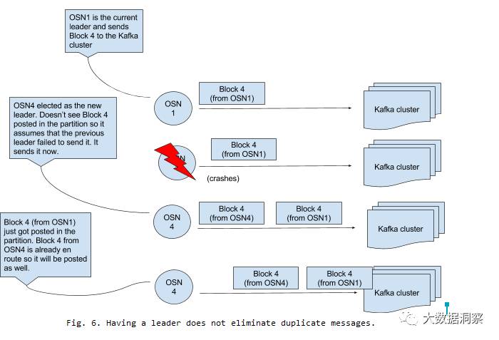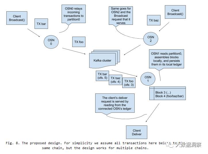 Solution 6b. How about if we had a leader OSN that would be responsible for posting the next block to partition 1? There are several ways to elect a leader; for example you could make all OSNs compete for a znode in ZooKeeper, or have the leader be the first node who had its TTC-X message posted in partition 0. Another interesting approach would be to have all OSNs belong to the same consumer group, which means that each OSN gets to own (exclusively) a partition in a topic. (Assume a topic that carries only all partition-0’s for all chains, and another topic that carries all partition-1’s.) Then the OSN responsible for sending, say, the TTC-X message to partition-0, or posting the block to partition-1 for a chain, would be that chain’s partition 0 owner — and this is a state that is managed by Kafka and can be queried natively via the Kafka Metadata API. (Deliver requests to an OSN for a chain/partition it does not own would have to be redirected to the appropriate OSN behind the scenes.)