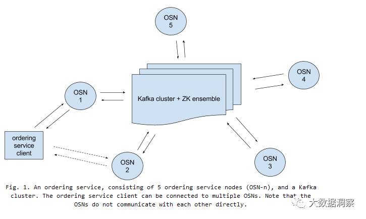 We use Kafka to provide ordering and support for multiple chains in a crash fault tolerant manner. The ordering service consists of a Kafka cluster with its corresponding ZooKeeper ensemble, and a set of ordering service nodes that stand between the clients of the ordering service and the Kafka cluster (Fig. 1).