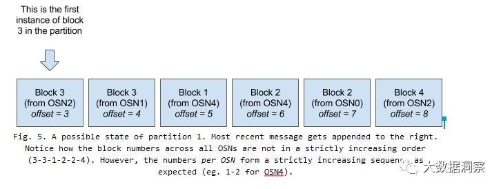 Solution 5a. In order to solve this, assume that we want to go all in on Kafka, and we create yet another partition — let’s call it partition 1, which implies that the partition we kept referencing so far was partition 0. Now whenever the OSNs cut a block they post it to partition 1, and all Deliver requests will be served by that partition. Since each OSN posts the block they cut in partition 1, we expect a sequence of blocks in there that does not translate directly to the exact chain sequence; there will be duplicates and, more generally, the block numbers across all OSNs will not be in strictly increasing order — Fig. 5 shows an example of this.