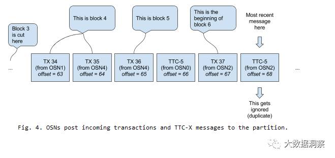 Solution 3. So cutting blocks based on time requires an explicit coordination signal. Let’s assume that each OSN posts a “time to cut block X” message on the partition (where X is an integer corresponding to the next block in the sequence) before it cuts a block, and that it won’t actually cut block X until it reads a “time to cut block X” message from the partition first. Note that it doesn’t have to be its own “time to cut block X” (hereinafter referred to as TTC-X for brevity); if every OSN waited for their own TTC-X message we would end up once again with diverging sequences. Instead, each OSN cuts block X either when batchSize messages have been collected, or when the first TTC-X message is received — whichever happens first. This implies that all subsequent TTC-X messages (for the same X) will be ignored by the OSNs. Fig 4. shows an example of how this could work.