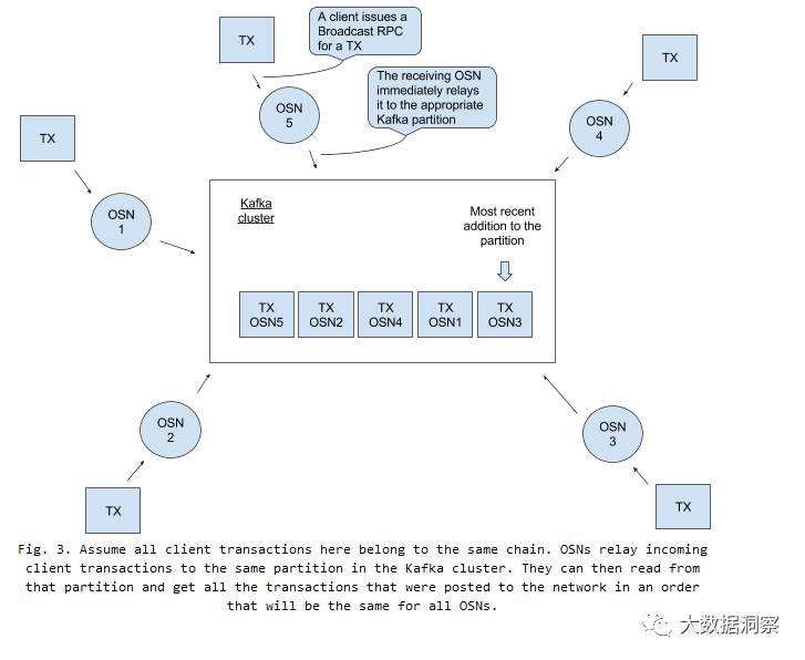 Solution 0. Assume then that for every chain we have a separate partition. Once the OSNs have performed client authentication and transaction filtering, they can relay the incoming client transactions belonging to a certain chain to the chain’s corresponding partition. They can then consume that partition and get back an ordered list of transactions that is common across all ordering service nodes. This is the high-level view of how we can use Kafka to achieve ordering (Fig. 3).