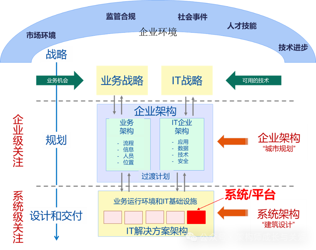 架构通常存在两个级别,一个是企业级架构,一个是解决方案级架构。企业级架构是从企业整体的视角来架构建模各领域架构的关注点,包括企业级业务架构和企业级IT架构。解决方案级架构是针对企业各领域架构的架构构建块或者一组架构构建块,进行的解决方案架构设计。企业架构描述的是企业是什么,需要什么能力,而解决方案架构回答的是如何实现和用什么方法、工具实现这些能力,比如是基于现有系统改造,还是全部自开发,还是通过购买套装软件实现这些架构构建块。IT解决方案最终表现为一个个的IT系统或平台的落地实现。本书所指的IT架构是IT解决方案级的系统架构。