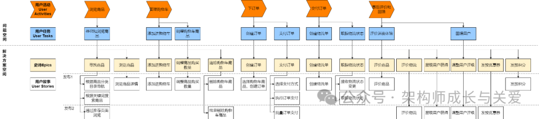 用户任务进一步分解成为可执行需求史诗(Epics),而一个史诗Epic又包括一组相关的用户故事(User Stories)。不同的故事可能优先级不同,按照产品的规划,对用户故事在纵向进行分组,按照产品特性的优先级顺序,确定用户故事所处的不同的发布周期。