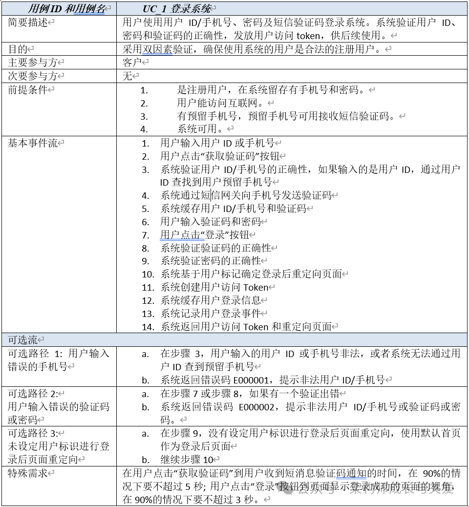 一个用例需要详细地描述出交互过程和系统处理逻辑,除了正常的处理流程,还需要详细描述出异常情况下系统的处理过程。包括用例模型和用例详细描述在内的需求规格说明书往往要作为赞助方业务用户签收的依据,也会作为后续编写用户测试案例的基础。特殊需求中可以描述用例的非功能性需求,如对性能的要求。