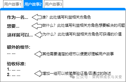 就像用例描述一样,我们可以遵循用户故事模板,对实际的用户故事进行相对全面的陈述。一个用户故事包括以用户为中心的期望陈述:“作为一个<用户角色>, 我想要<做什么事情>, 这样我可以<获得什么价值>”,还包括一些额外的细节便于软件开发工程师清楚地理解用户故事,以及最后通过验收的标准,软件开发工程师清楚工作完成到什么程度,该用户故事可以通过验收。