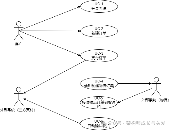 一般用例的参与方(Actor)可以有两种类型,一种是跟系统交互的人,一种是跟系统交互的其他系统,一般用人形来表示。一个功能用例(Use Case)是系统参与方同系统之间的交互行为,一般使用椭圆形表示一个用例,采用动词+名词的形式来命名,如“支付订单”。除了直观上使用一个或一组用例图来描述系统的功能,对于每一个用例,作为需求规格化的描述,需要进行更详细的用例描述。