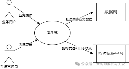 上图的示例显示,我们要建设的系统存在两类用户角色,一类是业务用户,在本系统上进行业务的操作,实现业务能力;另一类是系统管理员,进行系统的策略和参数配置和运维管理。另外还存在两个关联系统,一个是企业级的监控平台,按照客户IT架构要求,所有业务系统都需要统一能在监控运维平台实现监控,按照要求,本系统需要通过监控平台的接口发送系统运行的各项监控指标,另外本系统运行过程产生的日志信息也需要收集到监控平台,进行日志分析;另外一个系统是企业级的数据湖,本系统需要每天将业务数据同步给数据湖,以便进一步地挖掘业务价值,联合其他系统数据生成报表,基于模型形成业务洞察。由于这两个系统是本系统的关联系统,我们在进行本系统的架构设计和项目管理计划时,需要将相关的集成工作考虑进来。