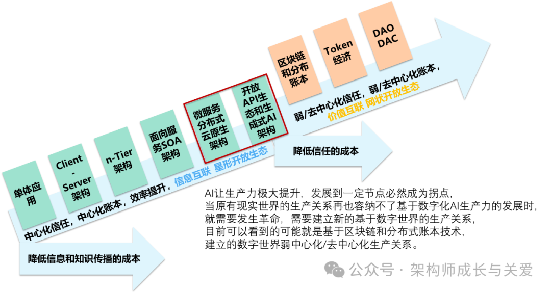 如上图所示,笔者总结了当今IT架构风格的演进过程和趋势。总体上来看,我们目前的实践还多处于微服务、分布式和云原生架构,以及开放API生态和生成式AI驱动的架构,主要体现为由单体架构和多层架构往分布式、微服务、云原生架构上进行现代化迁移,这个过程会结合开放API和生成式AI等要素提升生产力,实现开放生态经济和人工智能驱动的新业务模式。这条路线本着提升IT效率,降低企业内部和企业之间的信息集成成本,可实现低成本的信息互联式的星形开放生态。所谓星型开放生态,是指由多个主体构成的业务生态中,往往以一个核心的主体为中心,向四周其他主体进行业务发散,形成的以核心主体为中心的价值链生态。