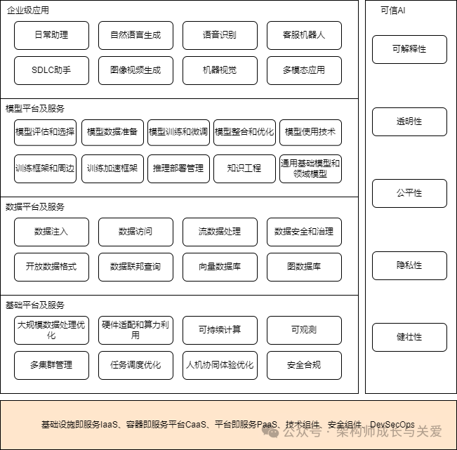 此外,因为种种原因,大模型会出现幻象、偏见、黑盒不透明、数据隐私和知识产权,以及易受到如提示注入攻击等安全风险。构建企业级生成式AI需要确保可信AI的非功能性需求的满足,包括结果可解释性、过程透明性、模型数据无偏见体现公平性、训练和检索数据的隐私性、以及整个系统的健壮稳定性。