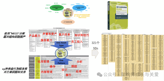 以银行业为例,银行业架构网络通过上述基本能力构建块的定义模式,识别和定义了金融行业321个服务域,这些服务域符合MECE原则,即服务域之间相互独立,又完全穷尽了金融行业所有的基本业务能力。具体内容可以阅读本人翻译的《银行业架构网络BIAN:全球数字化时代金融服务业框架》,文章后面有链接。