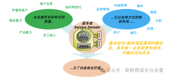 一个合适粒度的架构能力构建块具有唯一的业务职责和角色,其创造商业价值的能力是稳定的,不随时间而改变。只有通过交互才能创造价值,基本能力构建块定义了标准的交互模式,这些交互模式作用于企业有形或无形的资源上,会形成具有独特业务功能的能力。在BIAN里将这种方式构建的基本能力组件称为服务域。