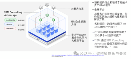 大模型AI的能力主要体现在两个方面,一个是其具备的知识,一个是其运用知识解决问题的能力。IBM Consulting Advantage使用Watsonx及合作伙伴AI大模型平台,能够充分利用各种大模型海量的预训练知识和通用技能,另一方面,其基于企业敏捷方法整合了IBM经过长久积累和经过实践检验的成熟的方法体系,使得大模型具备了更加专业的运用专业知识解决专业问题的专业技能,比如架构领域,项目管理领域。其提供了大量的基于提示词工程和RAG技术的智能助手和智能体,能够基于平台实现能力共享,并整合已有的企业资产和解决方案。