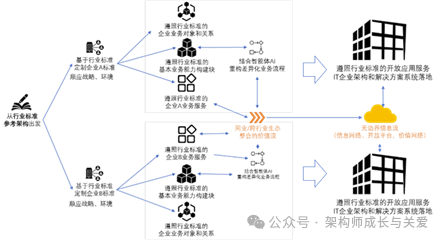 不同的企业都从行业标准的参考架构出发,定制出企业的架构标准,并以企业架构标准,形成符合行业标准的企业业务对象模型,基本业务能力模型和业务服务模型,结合智能体AI提供差异化、个性化的业务流程,并实现同业和跨行业生态整合的业务价值流,打造用户为中心,智能化个性化的场景产品。企业基于行业标准构建开放应用服务和IT解决方案系统,并通过无边界信息流网络,比如信息网络、开放平台和价值网络实现场景产品的落地。