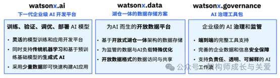 Watsonx是IBM打造的针对基础模型和⽣成式 AI 的新⼀代企业级 AI 与数据平台,提供⼀个包括 AI 开发平台、湖仓⼀体⽅案 和 AI治理 在内的⼯具包,加速企业使⽤可信数据,负责任地⼤规模应⽤ AI。