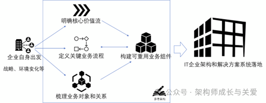 传统企业架构通常是从企业自身出发定义企业的核心价值流和关键业务流程,通过梳理业务对象和关系,构建企业可重用业务组件,进一步指导IT企业架构和解决方案系统的落地。