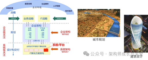 企业架构关注在企业级,是一种规划,基于规划形成的业务架构和IT企业架构能够支撑业务战略和IT战略,企业架构类似于城市规划,规定了企业的业务架构构建块和IT架构构建块以及构建块之间的关系,确保通过这些构建块的相互协作能够实现企业的价值主张,即企业面向市场的产品和服务,并能够支持和响应企业战略的变化和调整。为了满足业务发展和战略调整,企业架构往往会构建其过渡计划或路线图,确保业务架构和IT企业架构的渐进式调整,以适应新的市场机会或者技术变革。企业架构又包括了企业业务架构和企业IT架构,它们之间也是支撑和指导的关系。解决方案架构是企业架构构建块的落地,通常落地成IT系统/平台,所以系统/平台架构或者IT解决方案架构解决的是企业架构构建块如何进行IT落地的问题。系统/平台架构类似于建筑设计,其工作的上下文是企业架构,企业架构规定了其定位、功能和边界,以及它们相互间的交互关系。