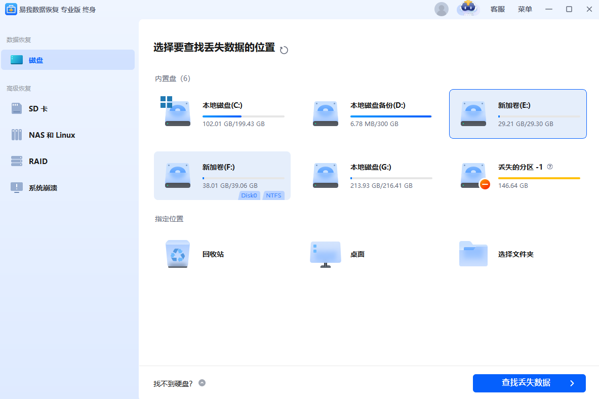 选择扫描位置:启动易我数据恢复软件,选择病毒攻击前数据所在的磁盘,点击“查找丢失数据”进行扫描。