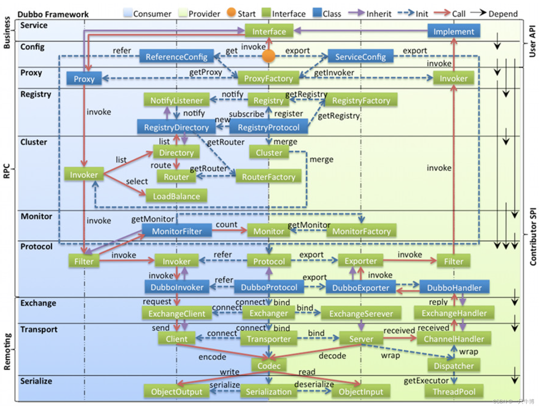 - 图中左边淡蓝背景的为服务消费方使用的接口,右边淡绿色背景的为服务提供方使用的接口,位于中轴线上的为双方都用到的接口。