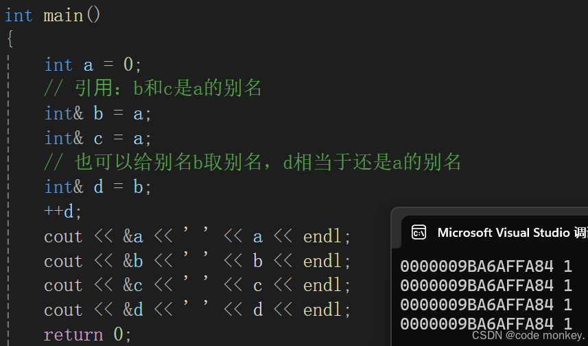 引用也是C++的一大特点。什么是引用呢,简单来说就是给一个已有的变量再取一个名字。引用不是新定义一个变量,而是给已存在变量取了⼀个别名,编译器不会为引用变量开辟内存空间,它和它引用的变量共用同⼀块内存空间。 比如:水浒传中的李逵,宋江叫他"铁牛",江湖上被称为"黑旋风"。