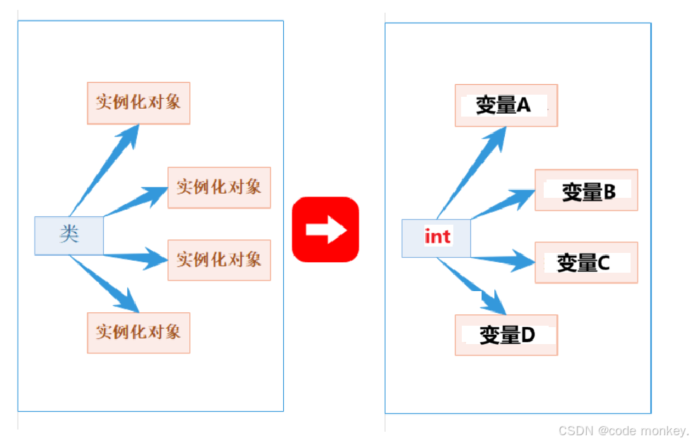 ⼀个类可以实例化出多个对象,实例化出的对象 占⽤实际的物理空间,存储类成员变量。打个⽐⽅:类实例化出对象就像现实中使⽤建筑设计图建造出房⼦,类就像是设计图,设计图规划了有多少个房间,房间⼤⼩功能等,但是并没有实体的建筑存在,也不能住⼈,⽤设计图修建出房⼦,房⼦才能住⼈。同样类就像设计图⼀样,不能存储数据,实例化出的对象分配物理内存存储数据。