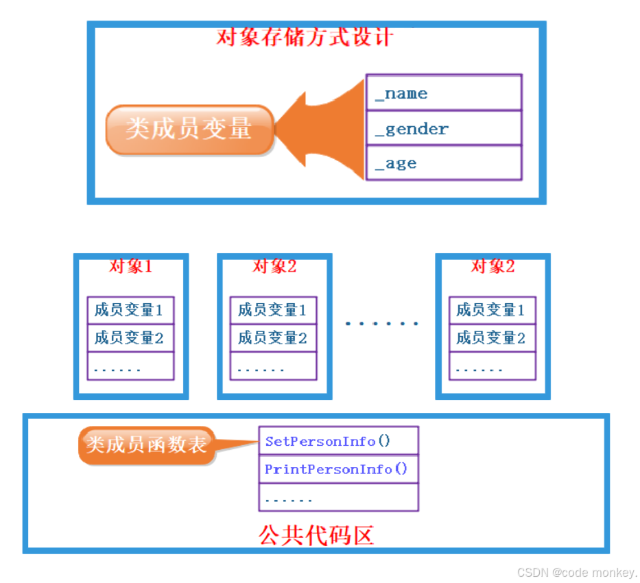 分析⼀下类对象中哪些成员呢?类实例化出的每个对象,都有独⽴的数据空间,所以对象中肯定包含成员变量,那么成员函数是否包含呢?⾸先函数被编译后是⼀段指令,对象中没办法存储,这些指令存储在⼀个单独的区域(代码段),那么对象中⾮要存储的话,只能是成员函数的指针。再分析⼀下,对象中是否有存储指针的必要呢,Date实例化d1和d2两个对象,d1和d2都有各⾃独⽴的成员变量year/month/_day存储各⾃的数据,但是d1和d2的成员函数Init/Print指针却是⼀样的,存储在对象中就浪费了。如果⽤Date实例化100个对象,那么成员函数指针就重复存储100次,太浪费了。这⾥需要再额外哆嗦⼀下,其实函数指针是不需要存储的,函数指针是⼀个地址,调⽤函数被编译成汇编指令[call 地址]