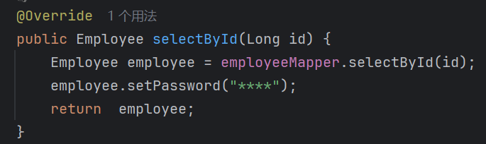 3.写查询回显的接口(根据id查询)时,因为接口文档要求返回员工的所有数据给客户端(那么其中就包含了员工的密码),虽然员工的密码进行了MD5加密后再存入的数据库,但是加密的密码是不是也不要显示给客户端,别人一个F12看到那个密码总归是不好的(保证安全),所以我们就给从数据库中查到的值重新赋值一个密码(不要把密码给暴露出去,不管是不是加密的)