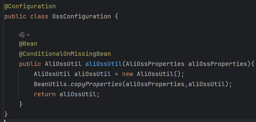 老师说为了保证阿里云OSS这个工具类的Bean对象是唯一的,因为它是工具类嘛,有一个就行了,然后老师就加上了@ConditionalOnMissingBean,但是这个注解并不能实现这个功能