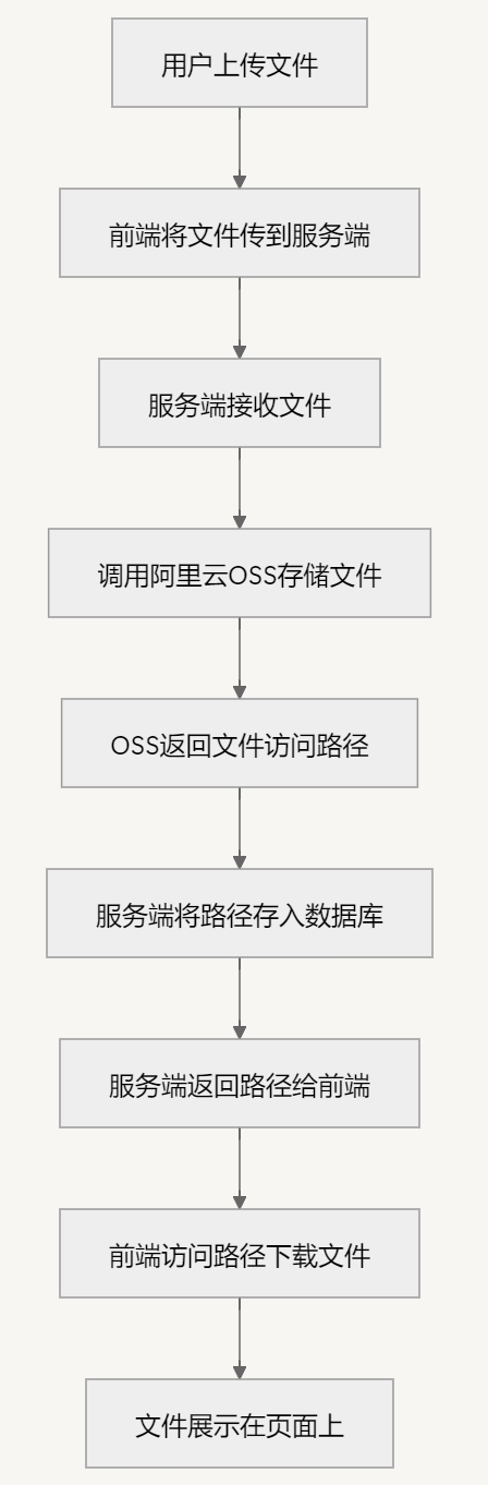 2.具体实现:通过用户上传文件 --> 前端将文件传到服务端 --> 服务端接收到文件 --> 调用阿里云OSS将文件存入OSS --> OSS再返回这个存入文件的访问路径(访问这个路径可以直接下载该文件)--> 服务端接收路径存入数据库 --> 再返回这个路径给前端 --> 前端访问这个路径直接下载这个文件将其展示在页面上