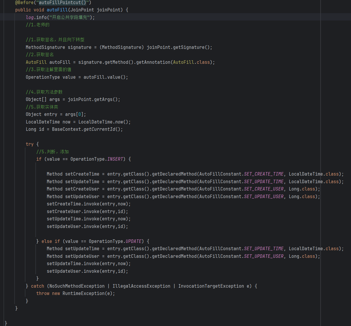 1.自定义注解@AutoFill 2.自定义切面类AutoFilAspect 3.Mapper对应方法上加入注解@AutoFill(update,insert方法)