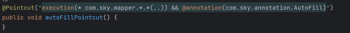 1.第一步:定义切入点(前面是定义扫描范围,后面是对应只扫描加入@AutoFill注解的方法)