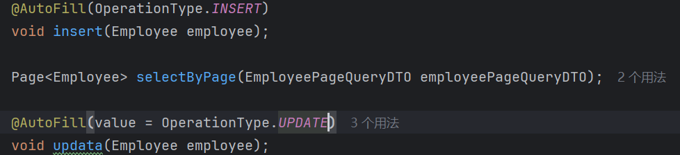 OpertionType是一个枚举类(定义了要抽取代码的Mapper方法功能名),而注解AutoFill里面要求我们用注解时必须给它一个Opertion的值 (具体知识点在下面扩展处)