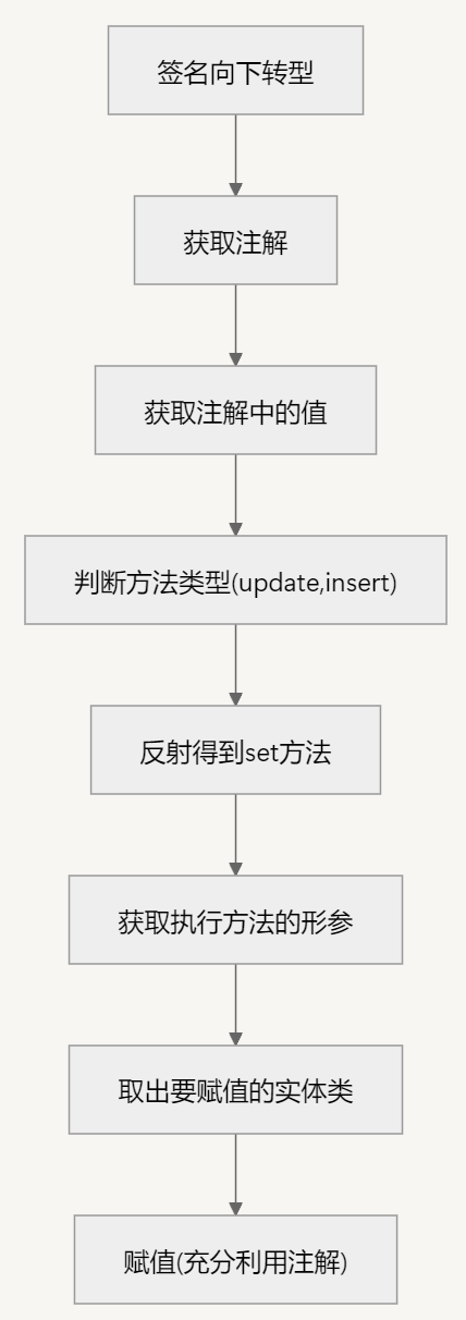 思考:这里老师使用的是:签名向下转型 --> 获取注解 --> 获取注解中的值 --> 判断方法类型(update,insert)--> 反射得到set方法(反射知识在下面) --> 获取执行方法的形参(一个准则:实体类放形参第一位,方便取出)-->取出要赋值的实体类 -->赋值(充分利用了注解)