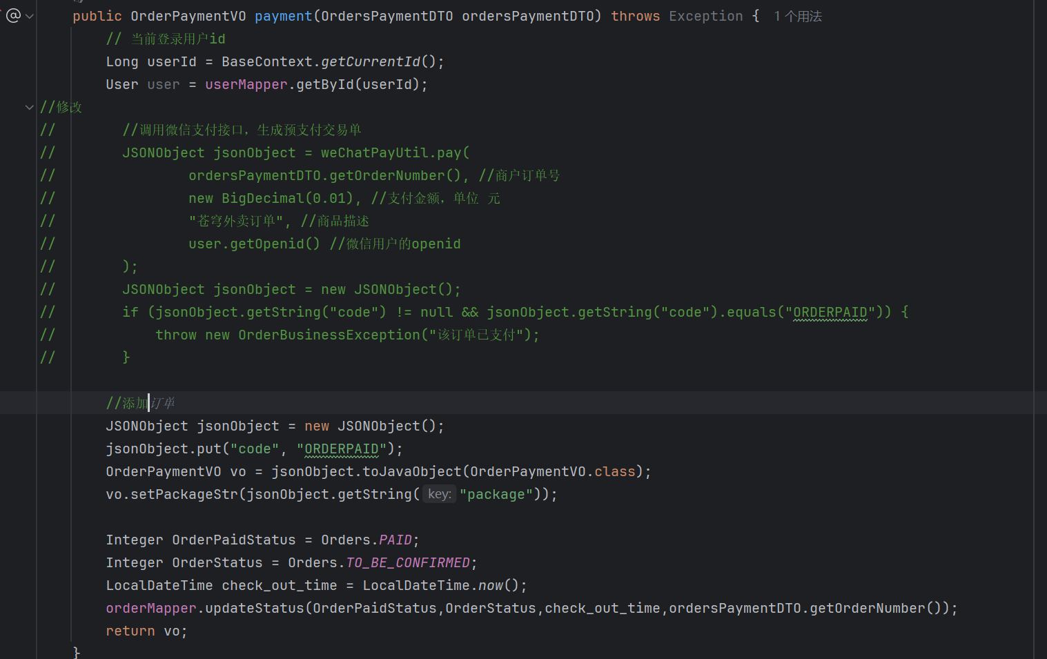 1.在OrderServiceImpl中修改并添加代码(选择不调用微信接口)
