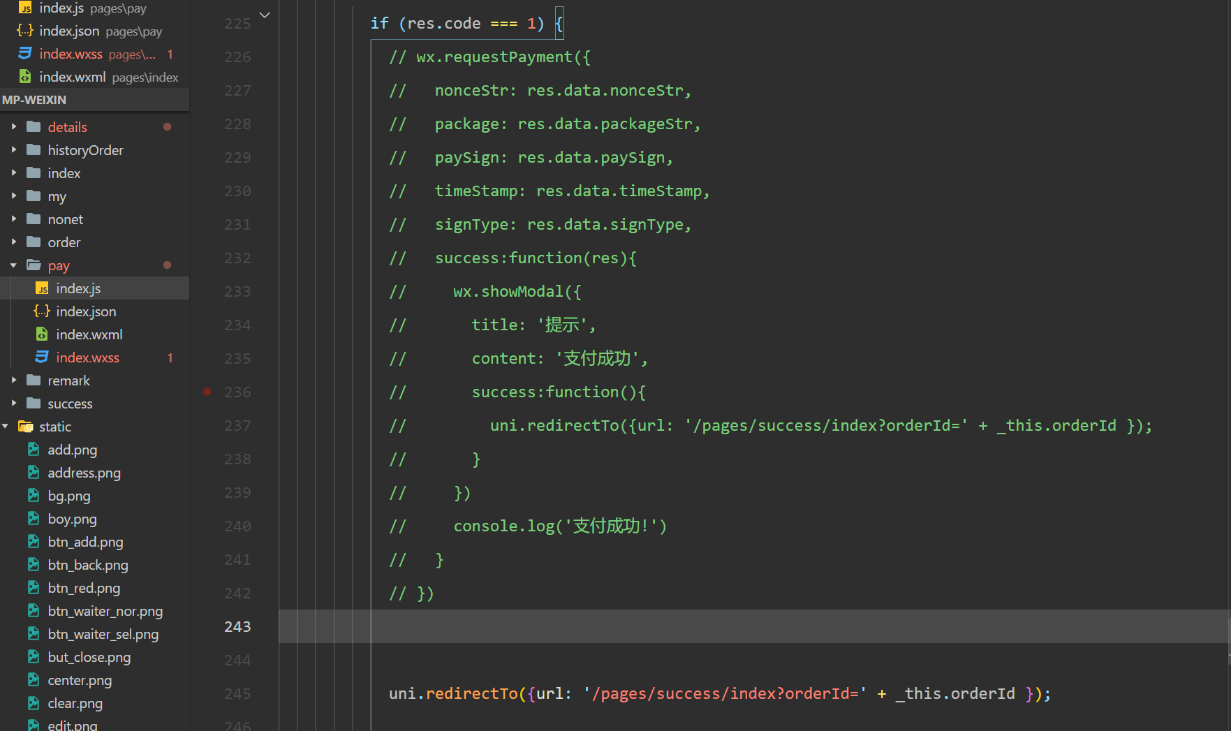 注意:因为我没有企业,只能使用个人注册小程序,而个人是无法使用微信提供的支付这个功能的(老师实现了,我们必须将代码修改一下,不然无法支付成功,并不方便以后的学习)