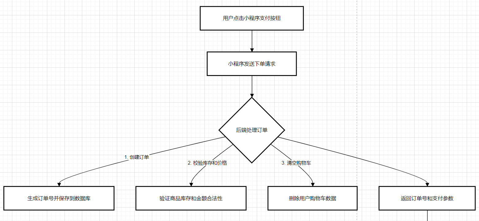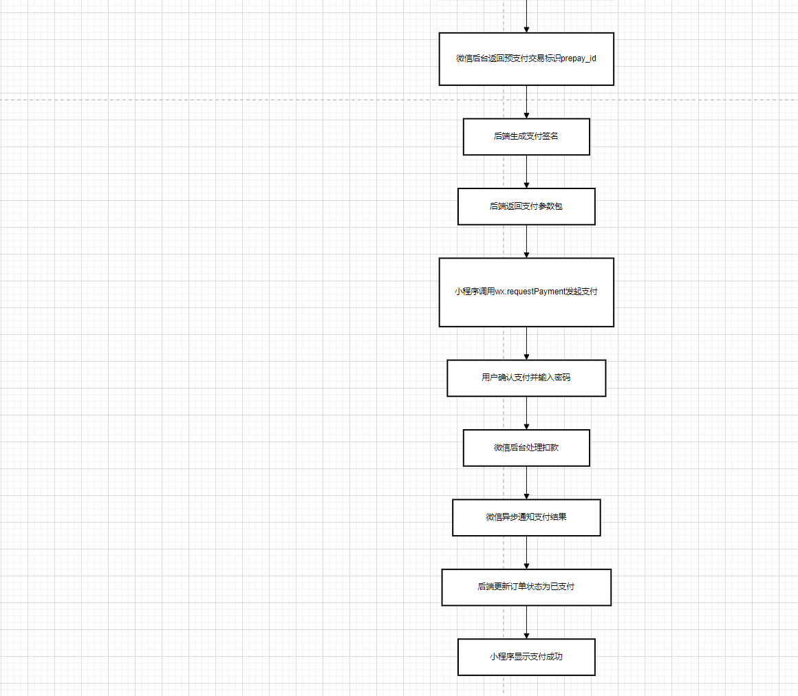微信用户下单 ==》小程序发送请求 ==》后端接收进行用户下单实现(上面) ==》返回数据,小程序接收 ==》小程序核对数据,没有问题就申请微信支付的请求 ==》后端接收到请求,根据微信文档,访问特定接口(微信下单接口) ==》微信后台接收到请求,返回预支付交易标识 ==》后端接收并将标识进行加密 ==》后端返回支付参数 ==》小程序接收,用户确认支付
