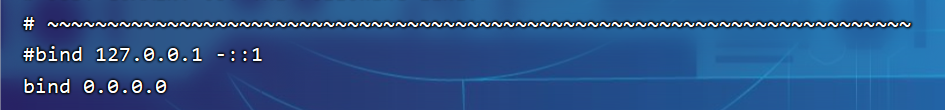 1.先进行备份防止出现错误:cp redis.conf redis.conf.bck 2.执行命令:vi redis.conf (进入文件中修改配置) 3.找到允许访问地址:默认是127.0.0.1,会导致只能在本地访问。修改为0.0.0.0则可以在任意IP访问(按进入编辑然后修改地址,按Esc退出编辑)