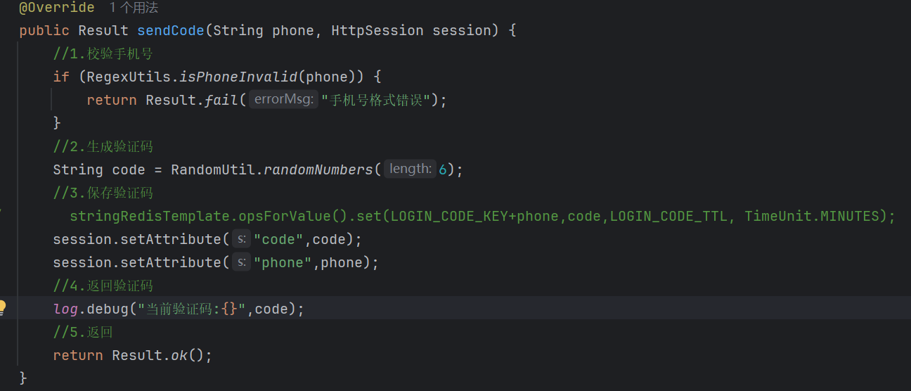 解释:我们这个是以手机号为唯一标识,前端提交用户输入的手机号,后端校验手机号的格式,符合就生成一个随机6位的数字验证码,并保存到Session中(为了后续登录与注册时校验用户验证码是否填写正确)(当然这里应该保存手机号与验证码,不然会有一个错误)