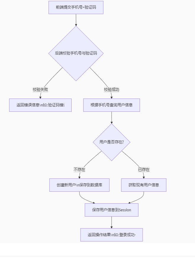 前端提交手机号和验证码 ==》校验手机号和验证码 ==》不通过返回错误信息,通过根据手机号查询用户信息 ==》判断用户是否存在 ==》不存在,创建新用户,并且保存到数据库中 ==》最终存在与不存在都将保存用户到Session中(方便后续校验登录状态) ==》结束