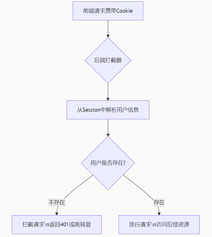 前端请求携带Cokie ==》后端拦截器从Session中获取用户信息 ==》判断用户是否存在 ==》不存在不放行,存在放行