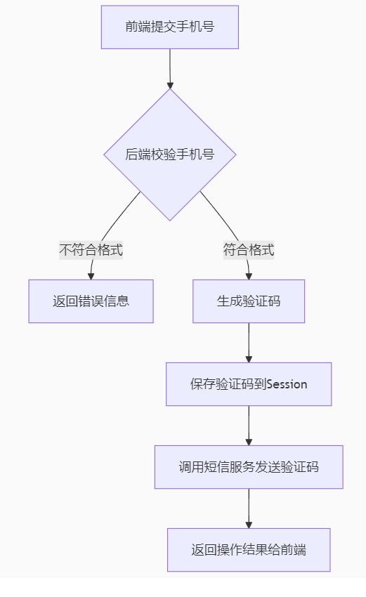 前端提交手机号 ==》校验手机号 ==》不符合返回错误信息,符合生成验证码 ==》保存验证码到Session(应该保存手机号与验证码) ==》发送验证码 ==》返回数据