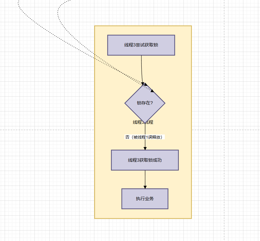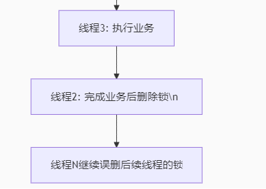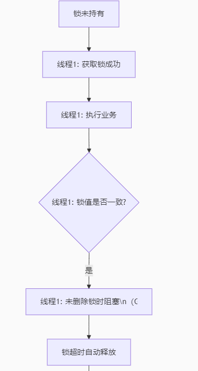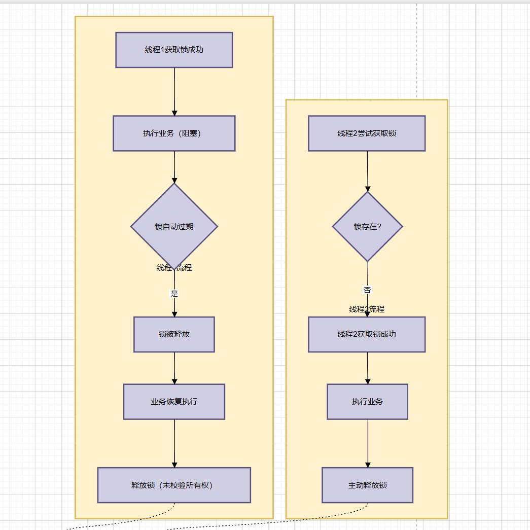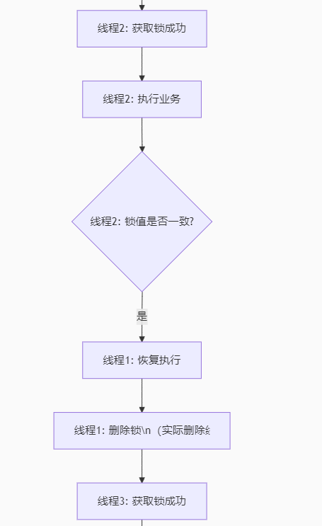 前提:锁还未获取 线程1获取锁成功 ==》线程1执行对应业务 ==》线程1由于执行业务时发生阻塞,导致执行时间过长 ==》线程1的锁自动释放 ==》线程2抢到执行权 ==》由于锁已经释放 ==》线程2获取锁成功 ==》线程2执行业务 ==》线程1抢到执行权 ==》线程1执行完业务 ==》线程1释放锁(细节:没有判断) ==》线程3抢到执行权 ==》由于锁已经释放 ==》线程3获取锁成功 ==》线程3执行业务 ==》最终线程1,2,3都执行了业务 ----- 最终我们本意是一人一单,但是现在是一人下了3次单,出现了并发执行的问题