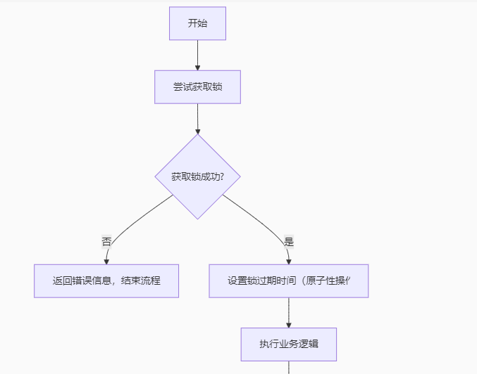 开始(跳过一些业务) ==》尝试获取锁 ==》判断获取锁是否成功 ==》获取锁失败 ==》返回错误信息,不再重试(由于实现的是一人一单,获取锁失败则已经下过单了) ------- ==》获取锁成功,设置过期时间(原子性操作) ==》执行业务 ==》业务超时/服务宕机 ==》锁自动释放(删除key) ------- ==》业务执行成功 ==》释放锁(删除key)